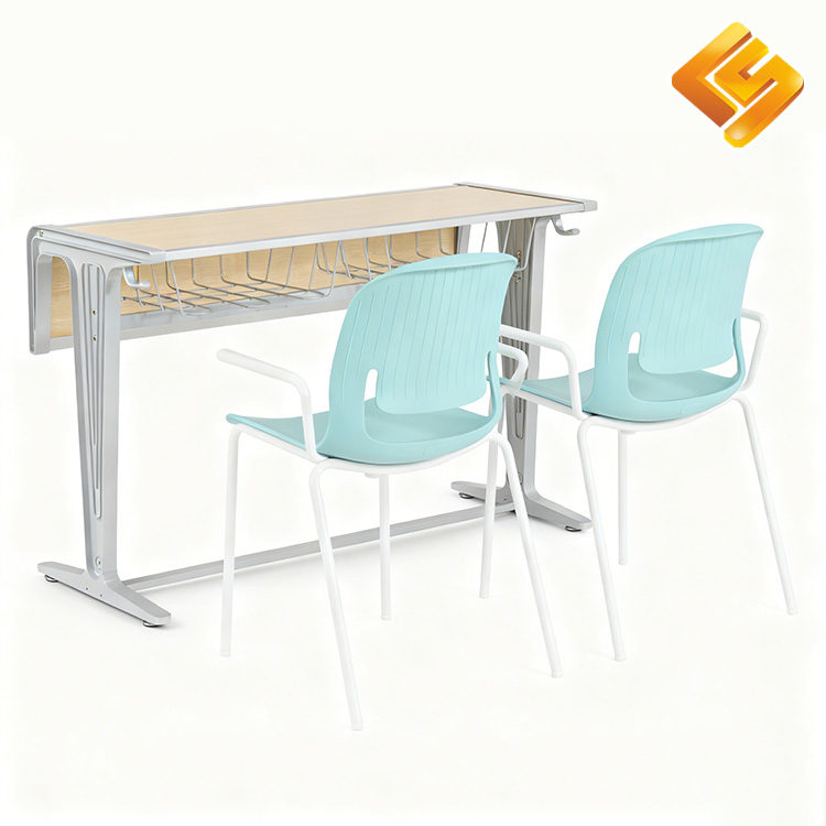 Designul pune accent atât pe funcționalitate, cât și pe estetică. Liniile curate ale oțelului inoxidabil și finisajul din lemn neutru creează un aspect profesional potrivit pentru o varietate de setari, inclusiv centre de formare corporative, biblioteci universitare și colțuri private de studiu acasă. Constructia fixa, robusta asigura stabilitate si reduce zgomotul si miscarea. Atunci când este utilizat într-un cadru instituțional, acest set de birou poate fi integrat în mod coerent cu alte elemente de mobilier, cum ar fi un pupitru pentru un instructor sau un birou interactiv de predare pentru instruire îmbunătățită tehnologic, completând un mediu de învățare sau formare modern și eficient.